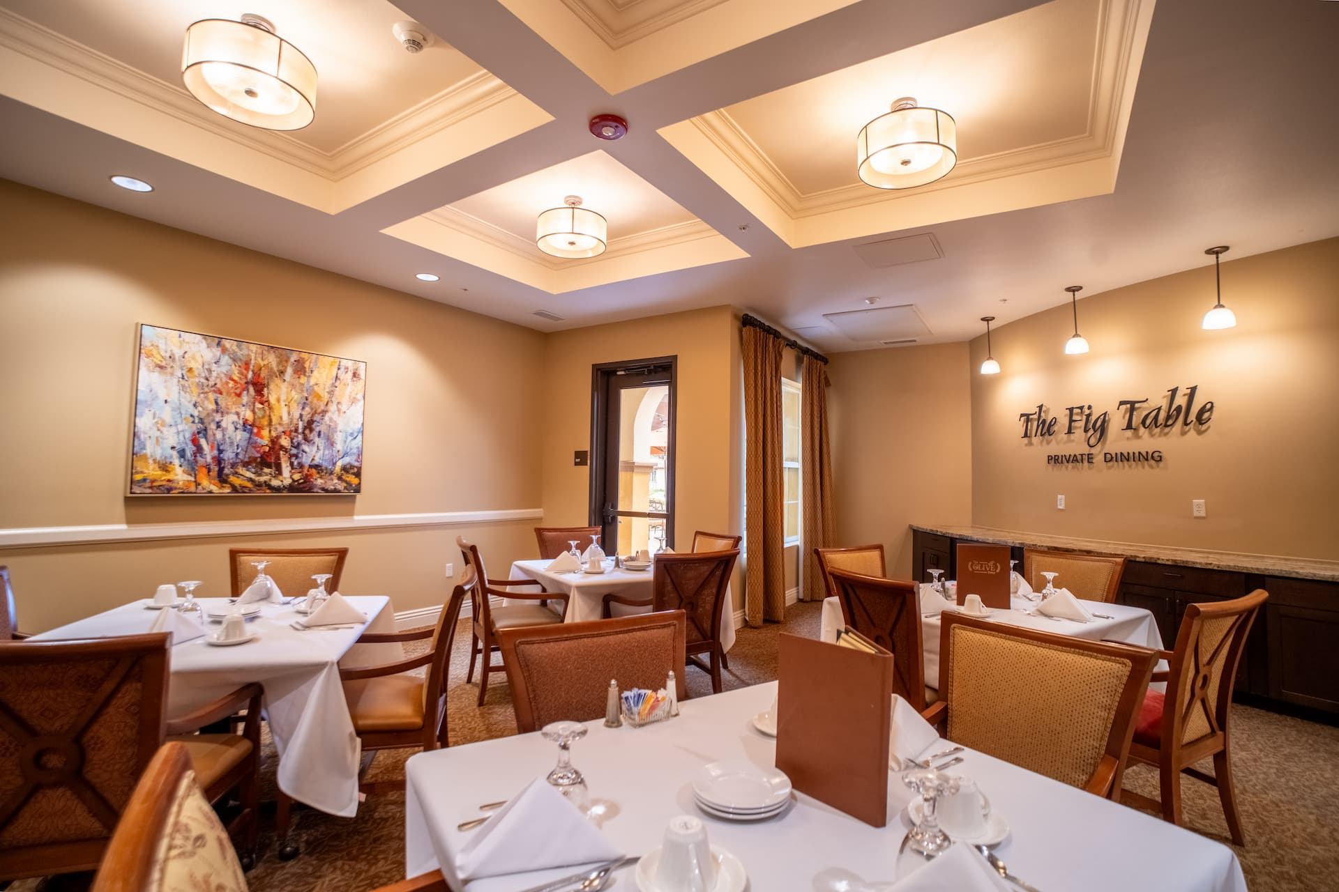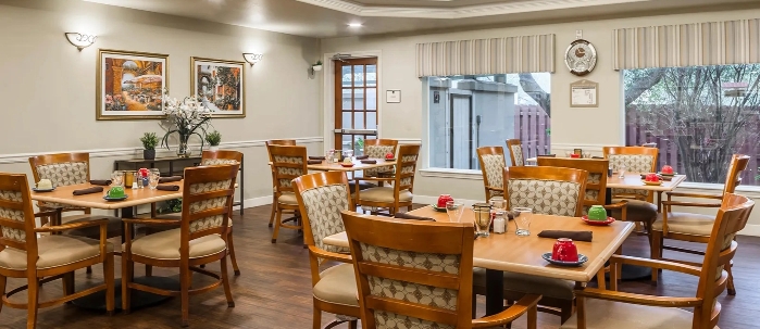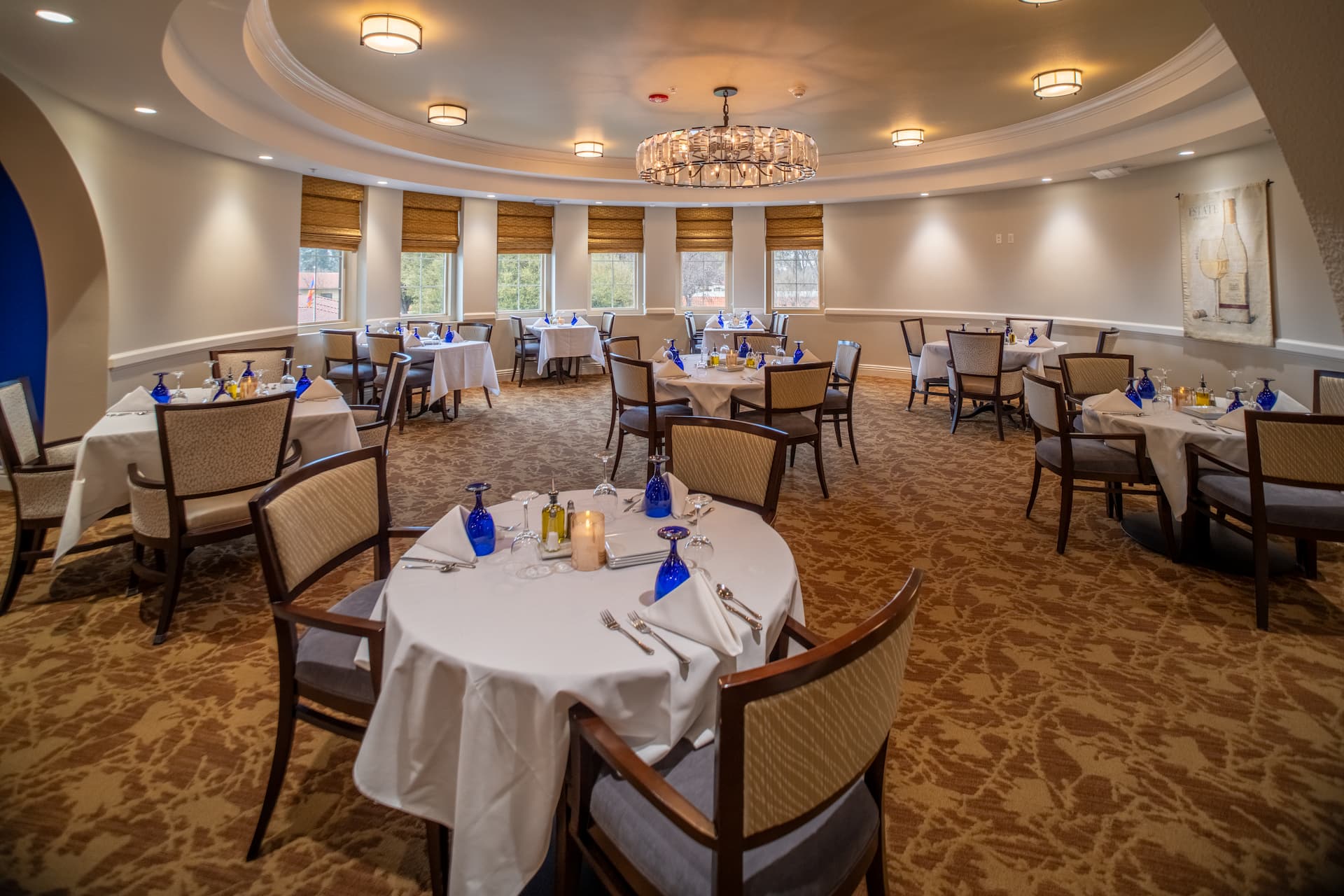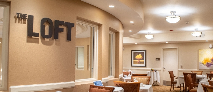 In The Loft dining room, residents of Assisted Living enjoy a welcoming atmosphere and attentive service that turns each meal into an experience of comfort and community.